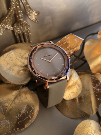 Изысканный бежевый кожаный ремешок идеально сочетается с циферблатом, создавая цельный и гармоничный образ. Высококачественная натуральная кожа обеспечивает комфортное ношение на протяжении всего дня, а регулируемая застежка гарантирует надежную фиксацию. Золотистые стрелки гармонично сочетаются с корпусом и придают часам законченный и роскошный вид.