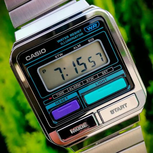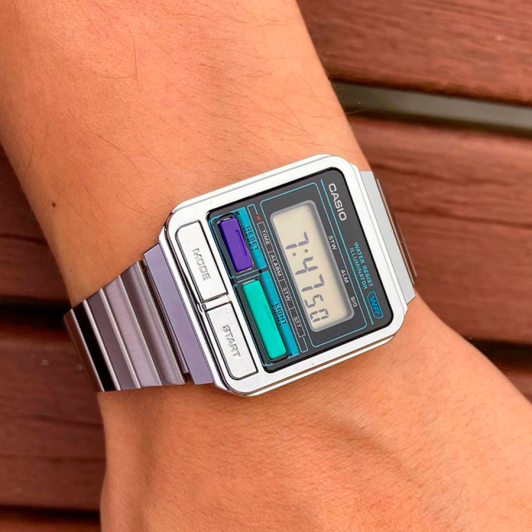 Отличительной чертой часов Casio Vintage A-120WE-1A являются 4 кнопки на лицевой панели. Часы вдохновлены гаджетами 1980-х годов.