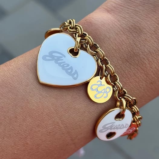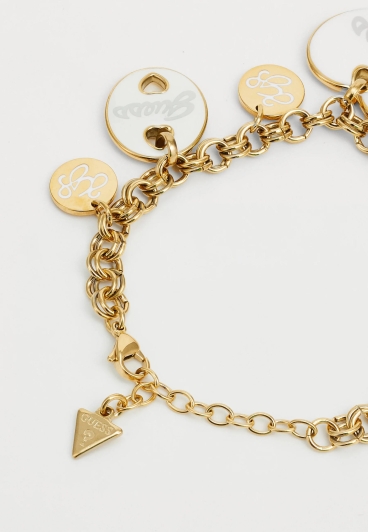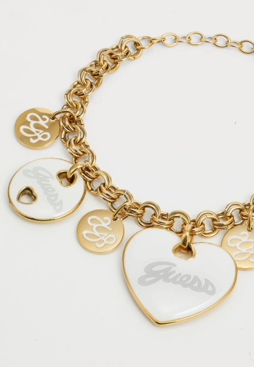 В центре внимания – большая подвеска в форме сердца, покрытая белоснежной эмалью, украшенная дерзкой надписью "Guess". Это символ любви к бренду и к себе. Браслет дополняют две круглые подвески с белой эмалью, также украшенные надписью "Guess". Эти элегантные детали добавляют игривости и узнаваемости. Завершающий штрих – несколько небольших круглых металлических подвесок с культовой монограммой бренда "G".