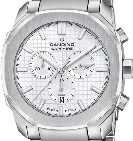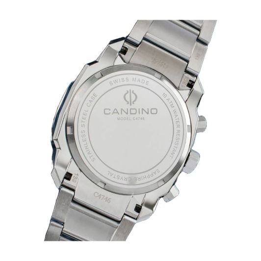Швейцарские мужские наручные часы-хронограф Candino Chronos Carree C4746/5 серебристого цвета с белым циферблатом и белыми индексами обеспечивает идеальную читаемость показаний благодаря сапфировому стеклу.