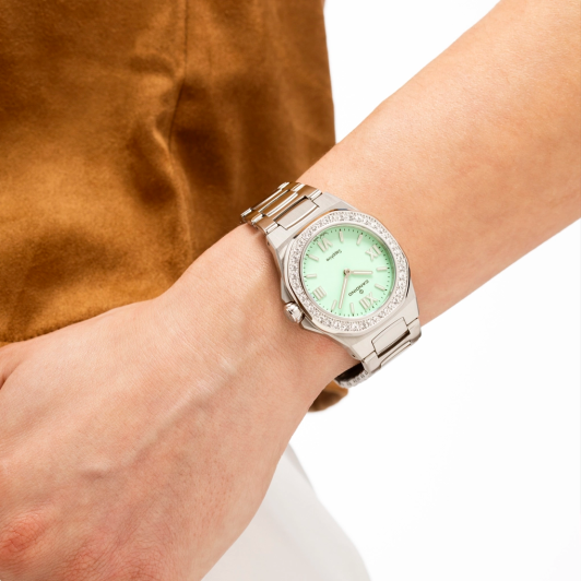 - светло-зеленый циферблат с накладными римскими цифрами;