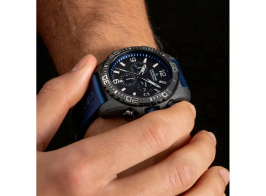 Корпус, выполненный из легкого, но невероятно прочного карбона, обеспечивает исключительную устойчивость к ударам и внешним воздействиям. Надежную защиту циферблата обеспечивает сапфировое стекло, устойчивое к царапинам. Синий каучуковый ремешок идеально дополняет карбоновый корпус, обеспечивая комфортную и надежную посадку на запястье.