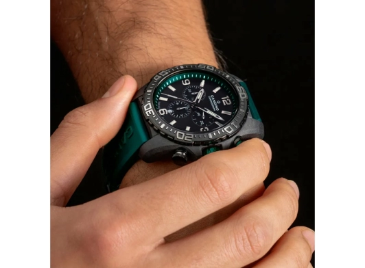 Долговечное сапфировое стекло надежно защищает циферблат от царапин и повреждений, сохраняя его безупречный вид. Зеленый каучуковый ремешок не только идеально дополняет карбоновый корпус, но и обеспечивает комфортную посадку на запястье, даже во время интенсивных тренировок.