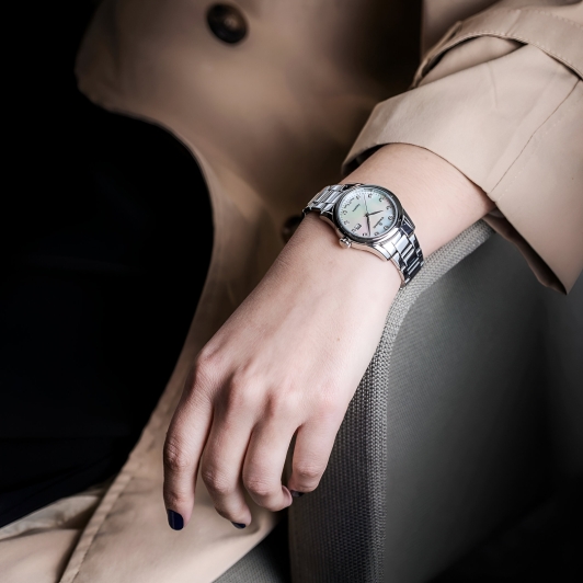 Молочно-белый перламутровый циферблат притягивает взгляд своим нежным сиянием, создавая ощущение утонченности и стиля. Апертура даты, расположенная на отметке «3 часа», добавляет практичности, позволяя всегда быть в курсе текущего времени.
