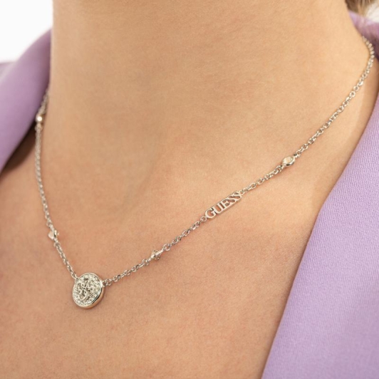 Главным акцентом украшения является круглая подвеска в форме монеты. На ее поверхности искусно выгравирован фирменный логотип бренда Guess (символ 4G), что подчеркивает принадлежность к известному модному дому. Детали подвески также инкрустированы мелкими кристаллами, обрамляющими логотип и усиливающими сияние.