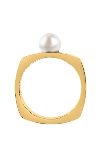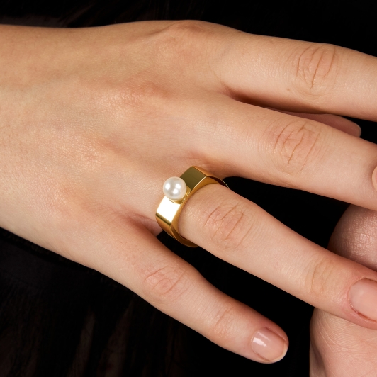 Широкая квадратная форма с закругленными углами – это современный и дерзкий дизайнерский ход. В центре внимания находится крупная белая искусственная жемчужина, закрепленная в верхней части кольца. Она добавляет этому смелому украшению нотку нежности и изысканности.